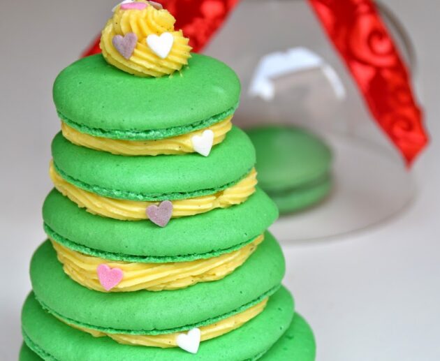 Bradut de Craciun din Macarons cu crema fina de vanilie. Un desert spectaculos si elegant, acest bradut de Craciun din macarons verzi, umpluti cu crema