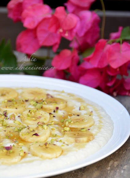 Pentru servire, asezati pe farfurii sau platouri intinse. Decorati cu felii de banana, miere si fistic macinat din belsug.