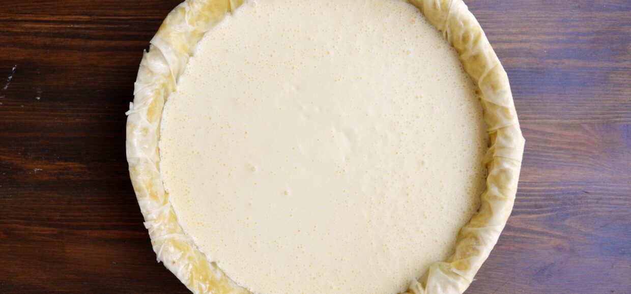 Turnam deasupra crema de branza, apoi taiem marginile de aluat filo care depasesc forma, cu ajutorul unei foarfeci.