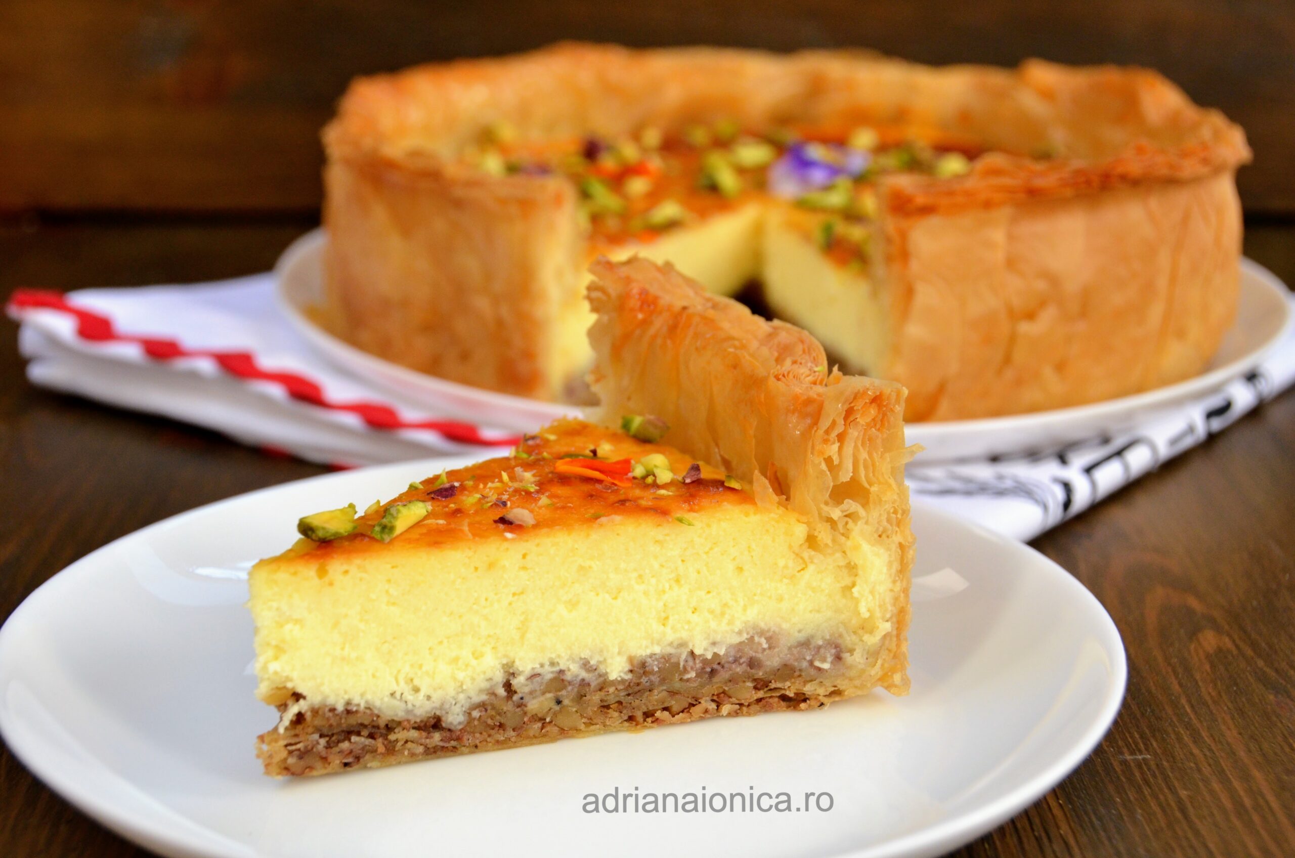 Exista deserturi care surprind de la prima vedere si cuceresc definitiv de la prima lingurita. Baklava Cheesecake este exact acel tip de desert. O combinatie indrazneata intre foile crocante de placinta, nuca aromata si cremozitatea fina a unui cheesecake clasic, totul legat de un sirop parfumat, exact cat trebuie de dulce.