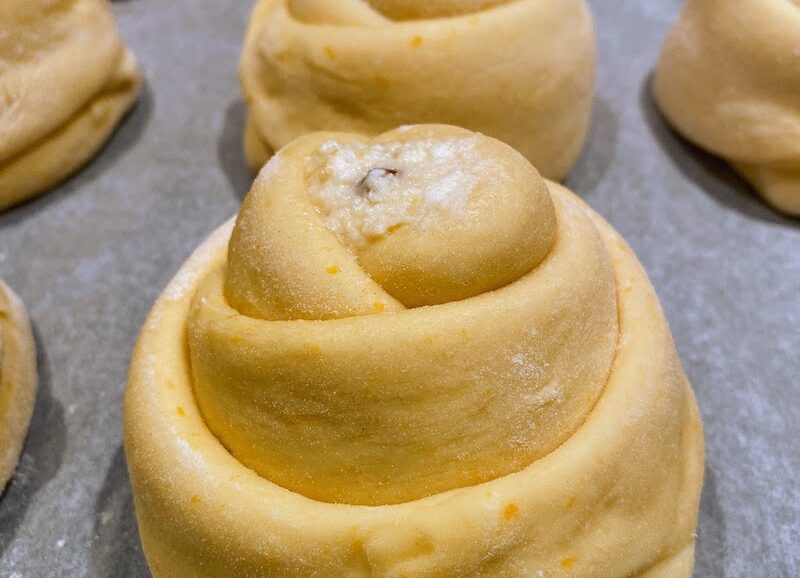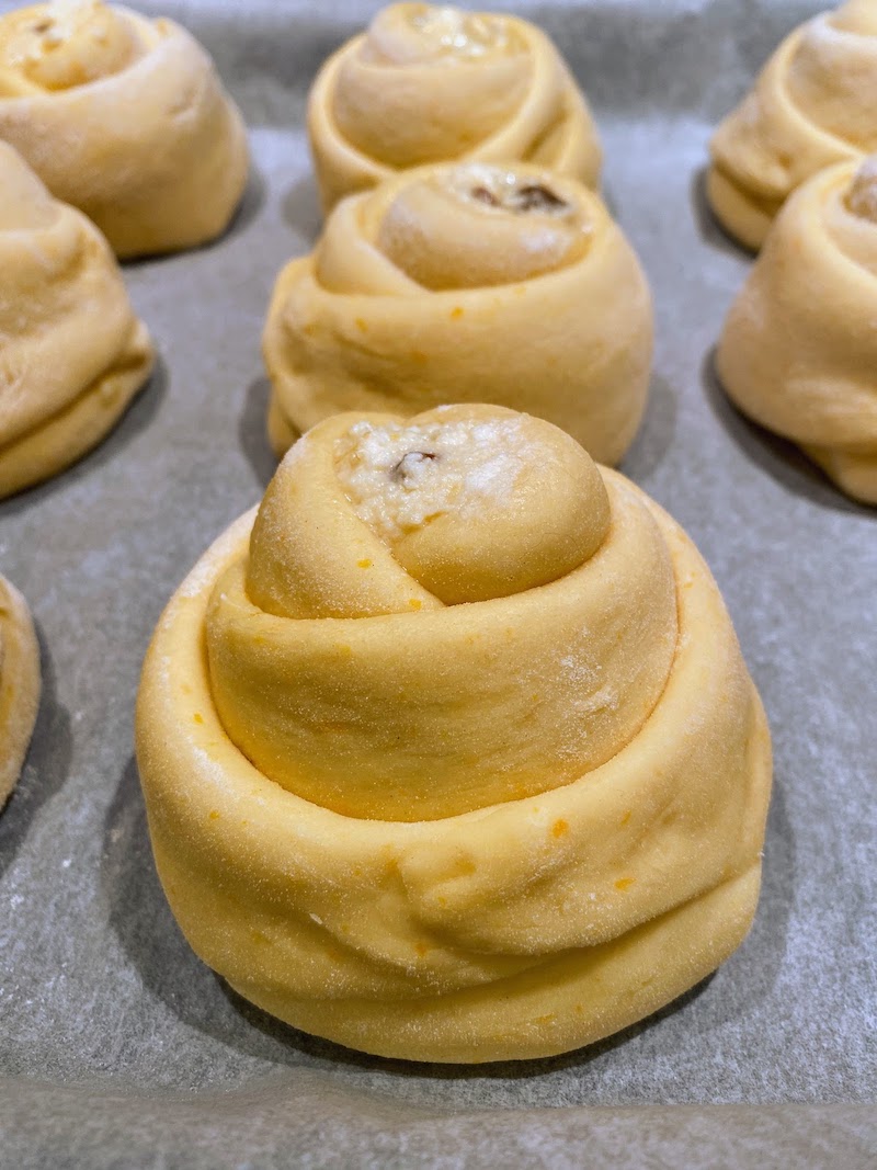 Pregatirea aluatului: laptele caldut se amesteca cu zaharul, drojdia si 2–3 linguri de faina. Se lasa deoparte pana cand drojdia se activeaza si amestecul devine spumos. Se adauga treptat galbenusurile, untul moale, vanilia, sarea, coaja rasa de citrice si restul de faina cernuta. Se framanta pana se obtine un aluat elastic si nelipicios. Aluatul se acopera si se lasa la dospit aproximativ o ora sau pana isi dubleaza volumul.