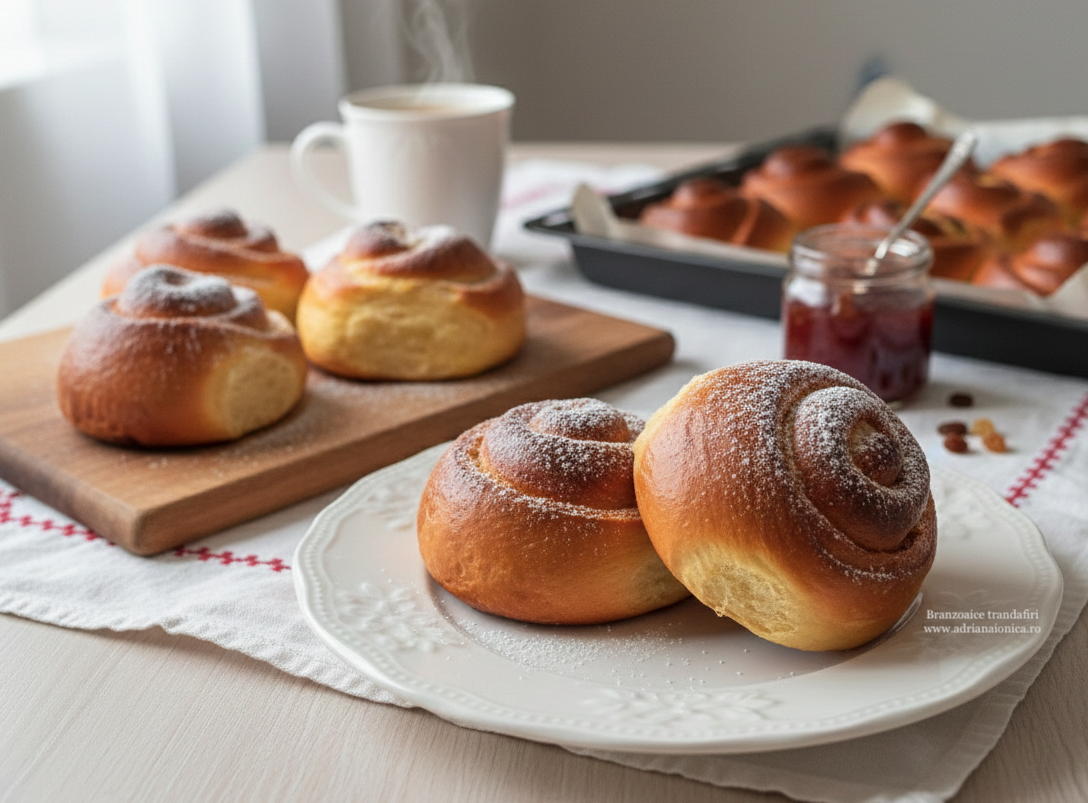 Putine deserturi de casa sunt la fel de frumoase si reconfortante ca aceste branzoaice modelate sub forma de trandafiri. Aluatul pufos, aromat discret cu vanilie si citrice, imbraca o umplutura generoasa de branza dulce, gris si stafide. Sunt ideale pentru mesele in familie, sarbatori sau pur si simplu atunci cand vrei sa umpli casa de miros de copt si bucurie.
