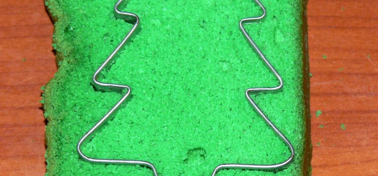 Checul cu cacao: Pregatiti compozitia pentru checul cu cacao procedand la fel ca la cel verde, doar ca in faina cerneti cacaoa. Pe fundul tavii de chec puneti un strat subtire de compozitie cu cacao si nivelati bine. Asezati bradutii verzi decupati, unul dupa altul, pe mijlocul tavii, intr-un singur sir. Turnati restul de compozitie cu cacao peste braduti, avand grija sa ii acoperiti complet. Coaceti checul la 180°C pentru aproximativ 40 de minute.