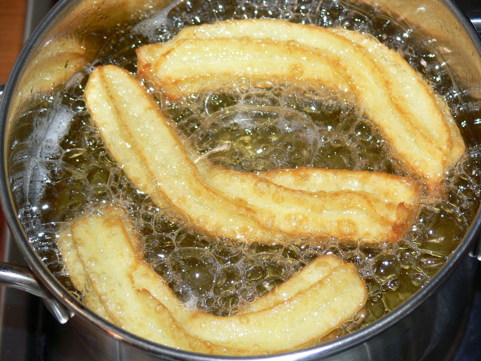 Într-o tigaie adâncă cu ulei încins se formează bastonașe lungi de aproximativ zece centimetri. Churros se prăjesc până devin aurii și frumos rumeniți, având grijă ca focul să fie mediu pentru a nu se arde la exterior.