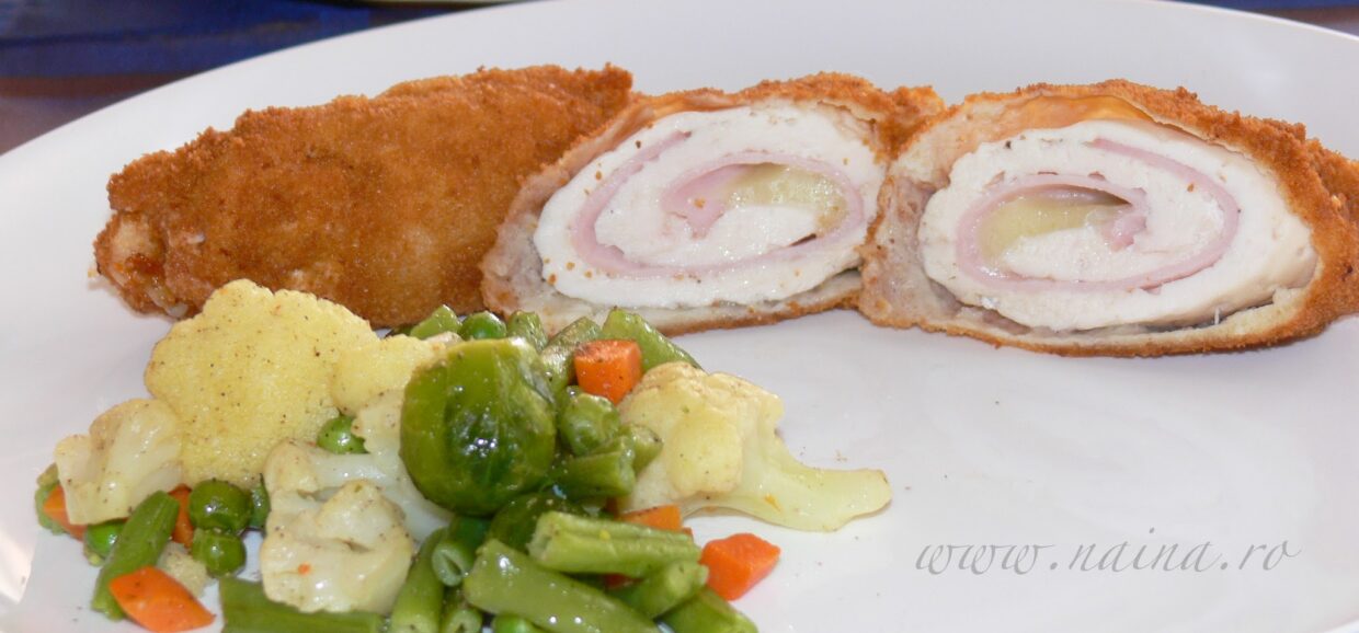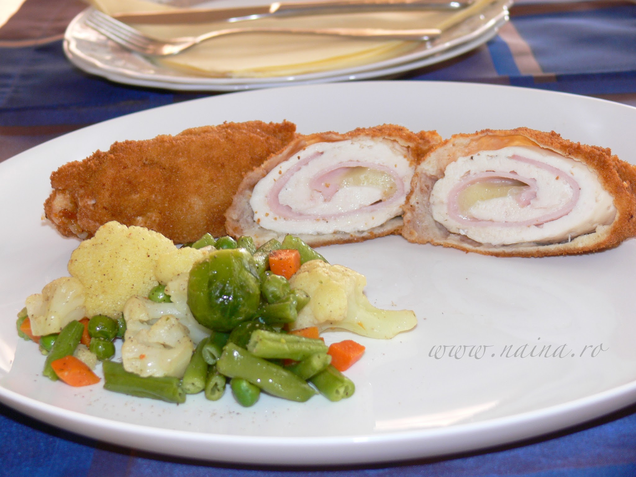 Pe fiecare bucata de carne se aseaza cate o felie de muschi sau sunca si o felie de cascaval. Bucatile se ruleaza cu grija, apoi se fixeaza la capete cu scobitori, pentru a nu curge umplutura in timpul prajirii.
