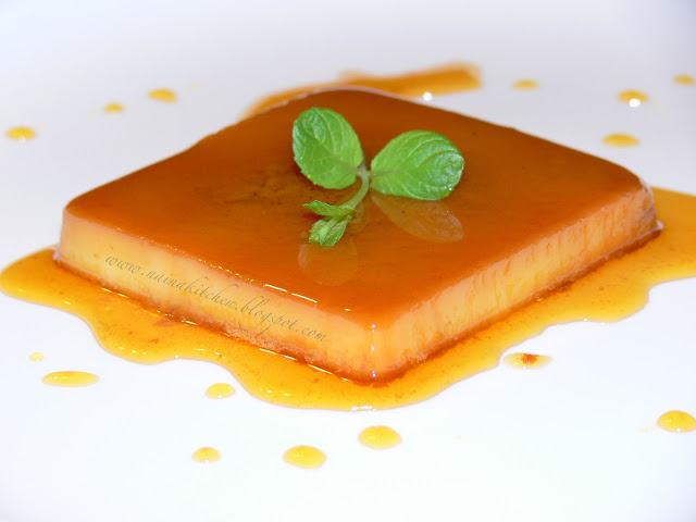 Turnați crema obținută în formele tapetate cu caramel. Așezați formele într-o tavă în care turnați apă fierbinte până ajunge la jumătatea recipientelor. Coaceți la 150°C, timp de aproximativ o oră, sau până când crema capătă textura unei piftii elastice.