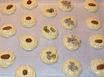 Cu ajutorul unui posh se formeaza fursecurile direct in tava tapetata cu hartie de copt, avand grija sa lasam spatiu intre ele, deoarece vor mai creste putin la coacere. Daca nu aveti posh, puteti pune gramajoare mici cu ajutorul unei lingurite. Deasupra fiecarui fursec se adauga nuci, alune, fistic sau semintele preferate, apasand usor pentru a se fixa.