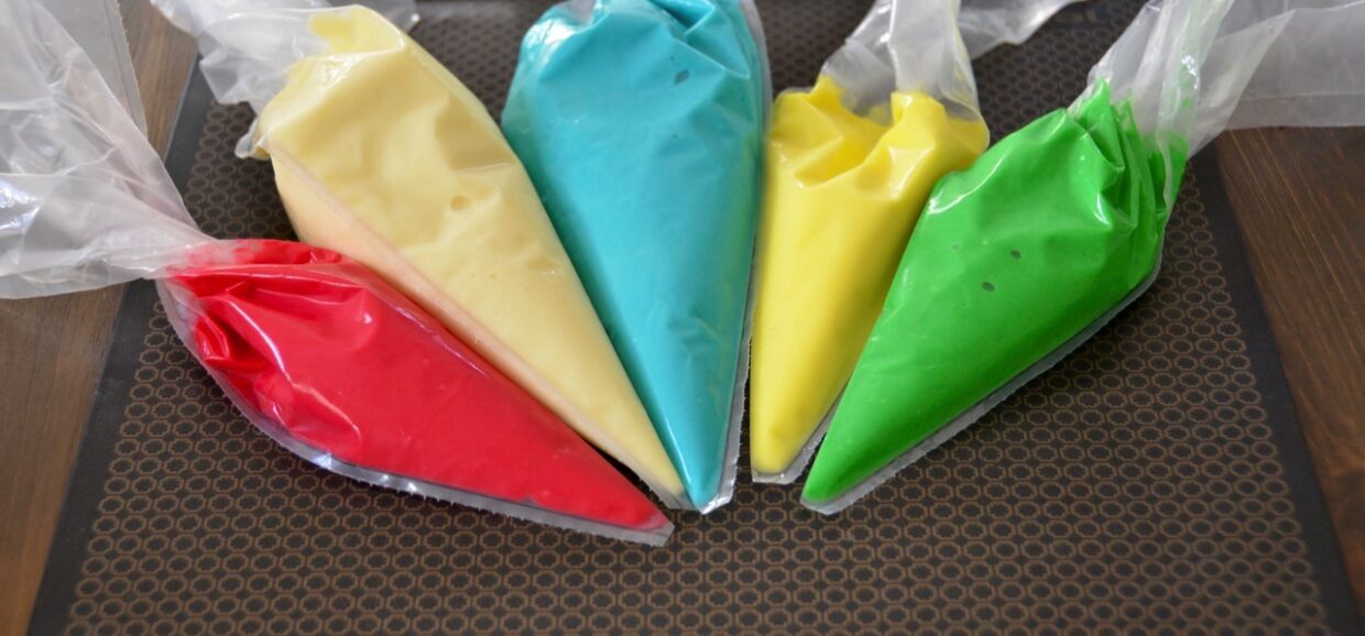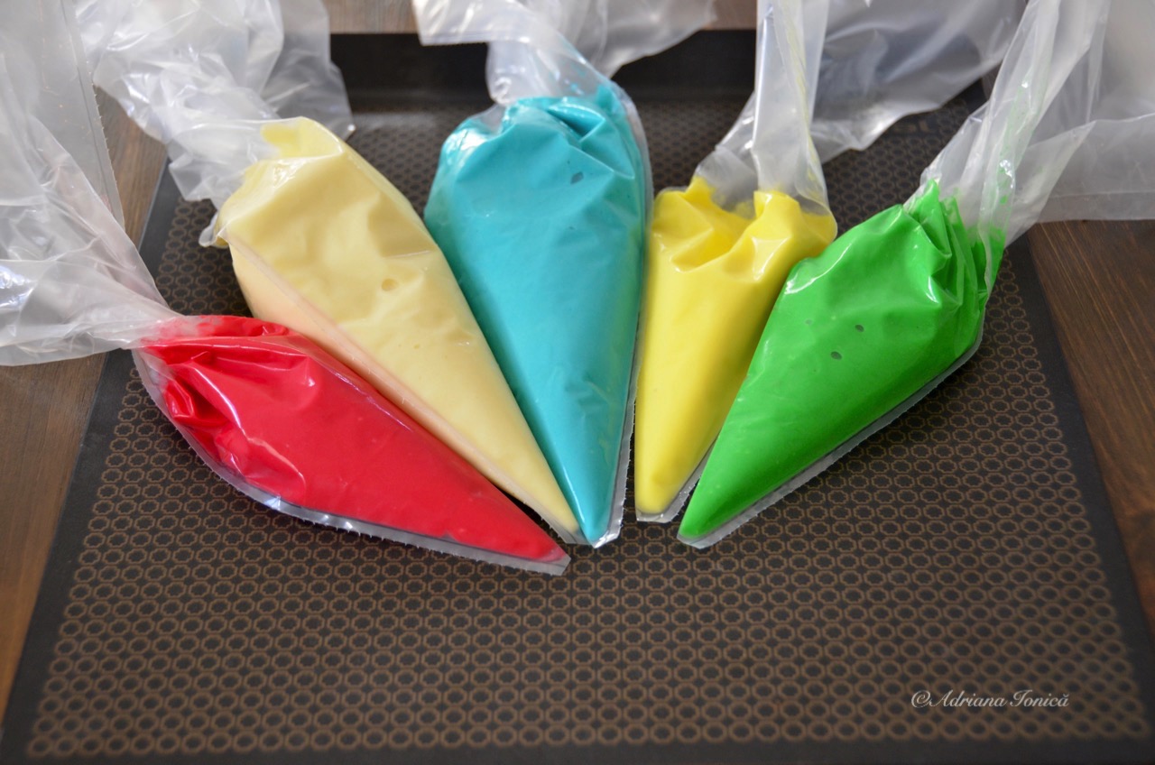 Prepararea cremei. Puneti intr-un bol toate ingredientele pentru crema. Mixati pana obtineti o crema densa. Impartiti crema in mai multe castroane, in functie de cate culori doriti. Adaugati colorant alimentar pana obtineti nuanta dorita. Un bol poate ramane alb pentru „zapada”, iar restul pot fi: verde, albastru, galben, rosu. Puneti cremele in poshuri sau in pungi rezistente, carora le taiati varful.
