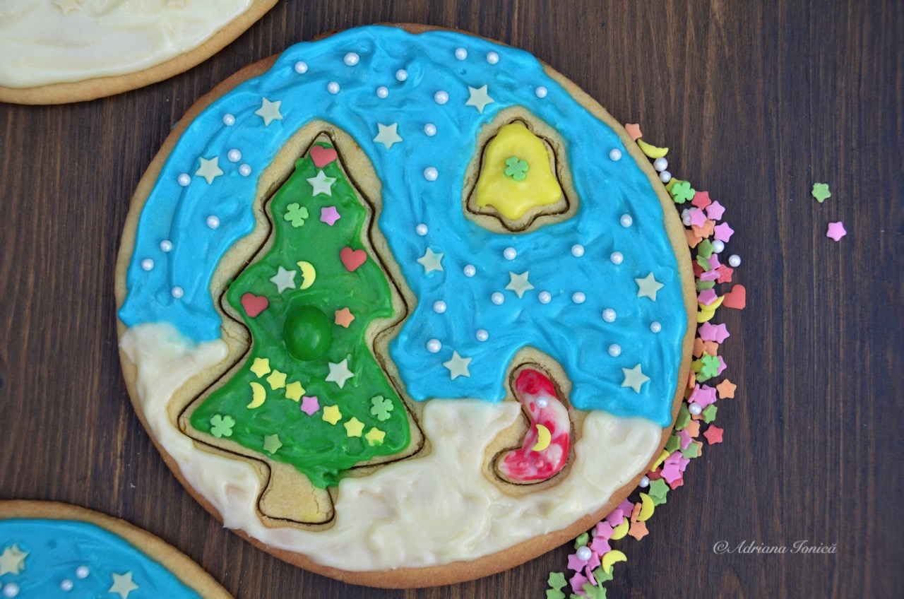 Decorate in nuante vesele de albastru, alb si verde, cu braduleti, stelute si fulgi de zapada, aceste fursecuri aduc atmosfera de poveste chiar pe masa de Craciun. Exact ca in imagine, ele pot deveni mici tablouri comestibile, gata sa bucure orice copil… si nu numai.