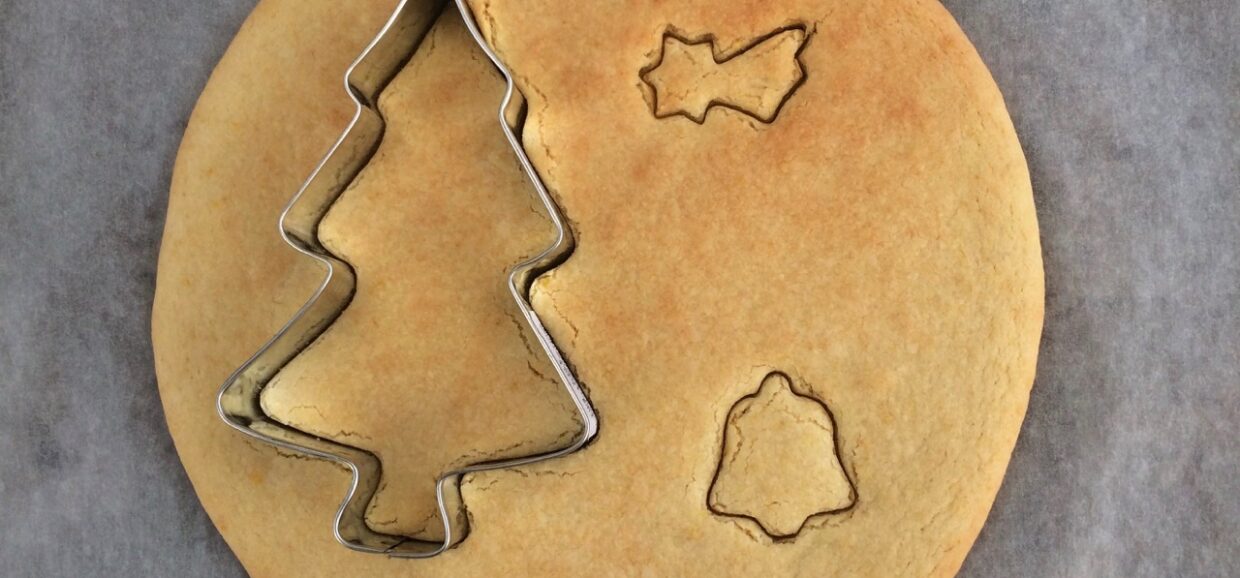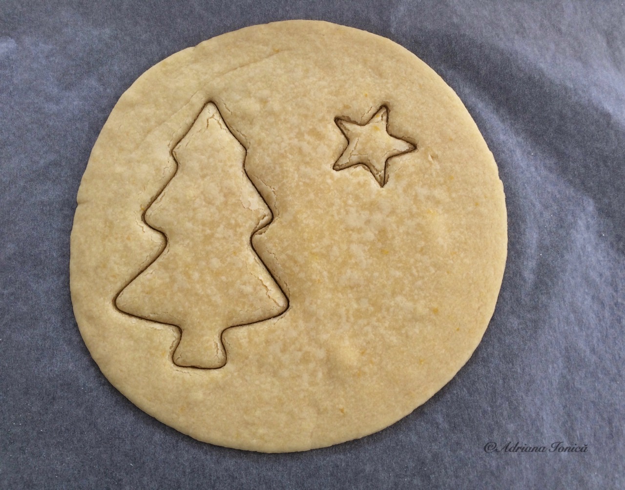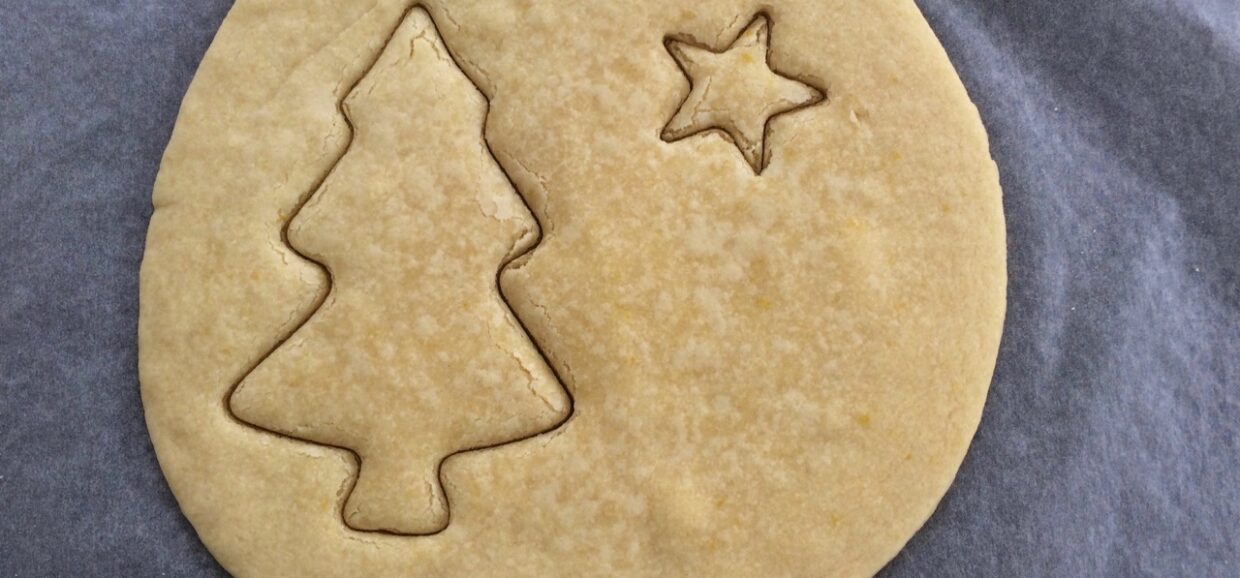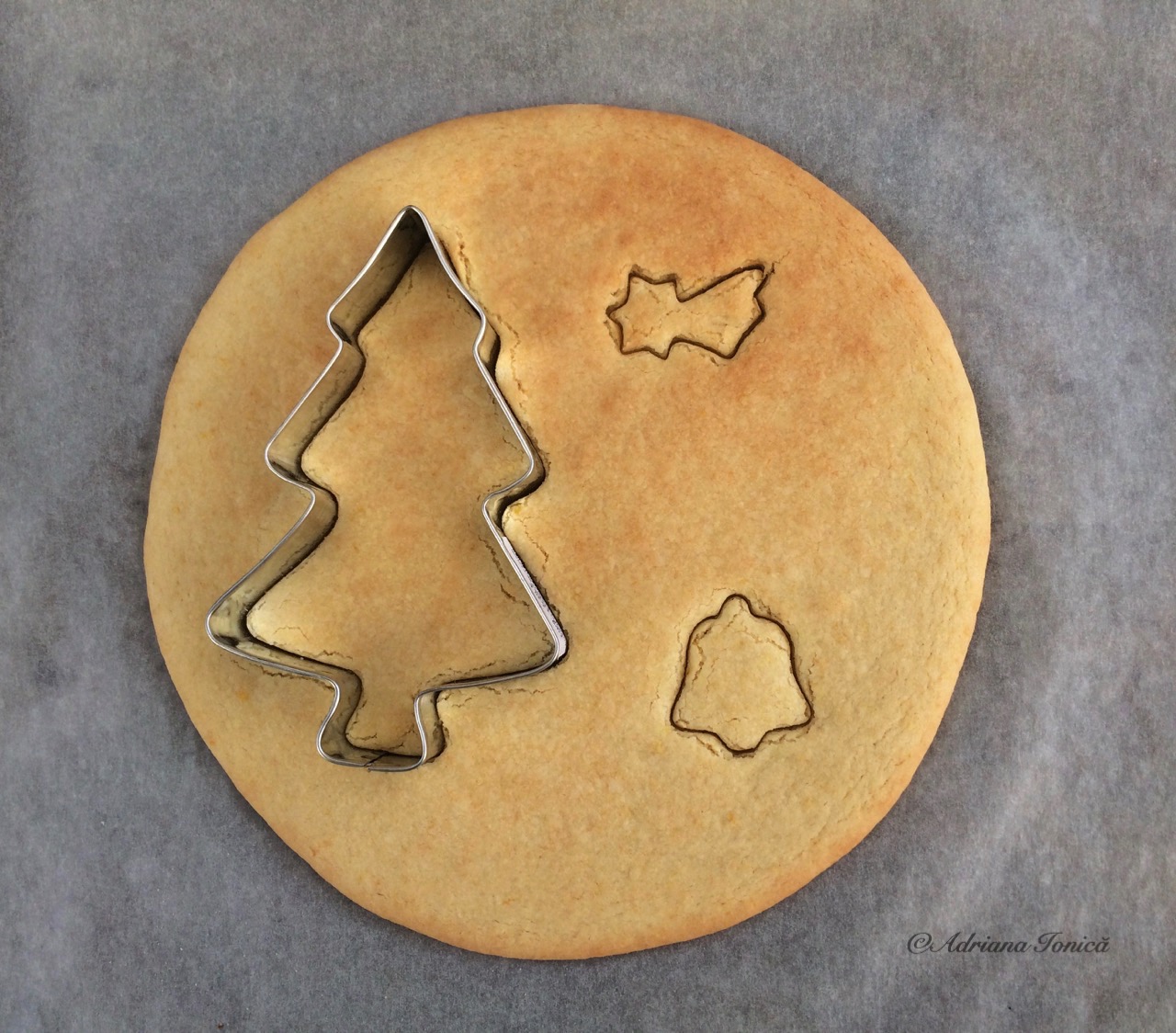 Porniti cuptorul si lasati-l sa se incinga la 180 grade. Pregatiti formele de decupat: braduleti, stelute, reni, oameni de zapada etc. Intindeti aluatul pe masa presarata cu faina. Nu il intindeti foarte subtire, trebuie sa fie putin grosut. Puneti deasupra o forma rotunda de 20 cm si taiati marginile. Puteti folosi o tava de tort, un capac sau o farfurie. Daca aluatul crapa, lasati-l 10–20 minute la temperatura camerei. Puneti forma obtinuta intr-o tava tapetata cu hartie de copt. Coaceti 5 minute.