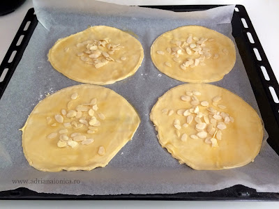 Preîncălziți cuptorul la 180 de grade. Așezați hârtie de copt într-o tavă și lăsați-o deoparte. Pe masa presărată cu puțină făină, întindeți foietajul și decupați 4 cercuri folosind un bol sau un castronel. Transferați cercurile în tavă, așezându-le pe hârtia de copt.