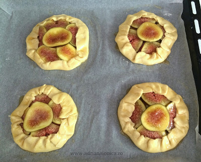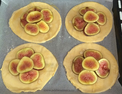 Deasupra migdalelor aranjați frumos feliile de smochine. Ridicați marginile aluatului în jurul fructelor, formând o bordură ușor pliată.