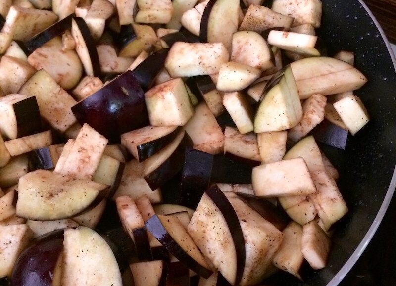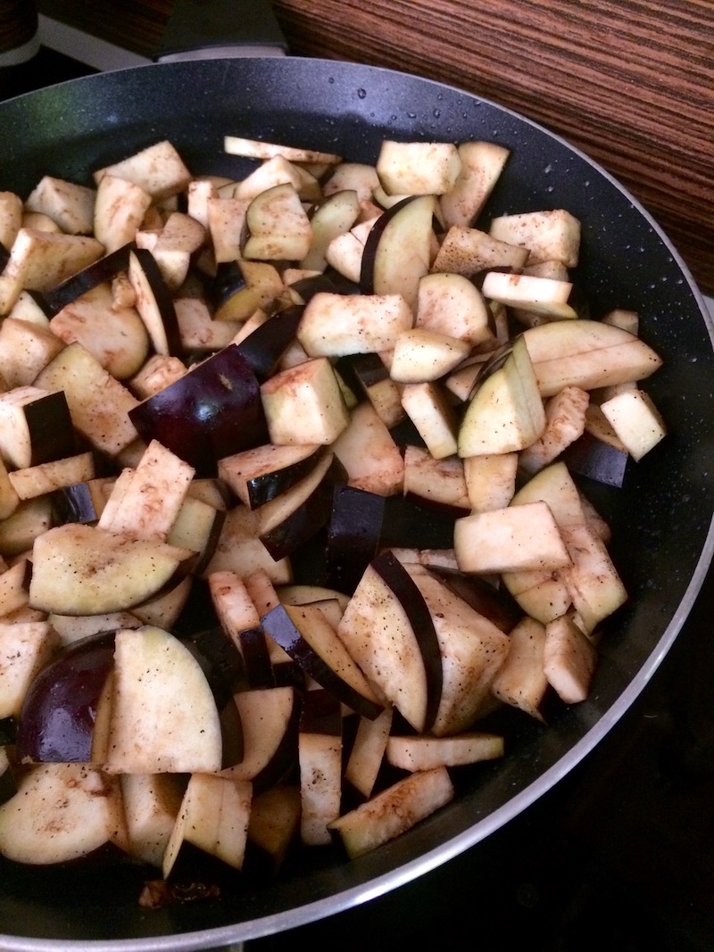 Vinetele, dovleceii si cartofii se taie cubulete si se prajesc pe rand in ulei incins. Este important ca uleiul sa fie bine incins, pentru ca legumele sa nu absoarba prea mult ulei. Se prajesc pana devin usor rumenite, apoi se adauga in tava, peste celelalte legume.
