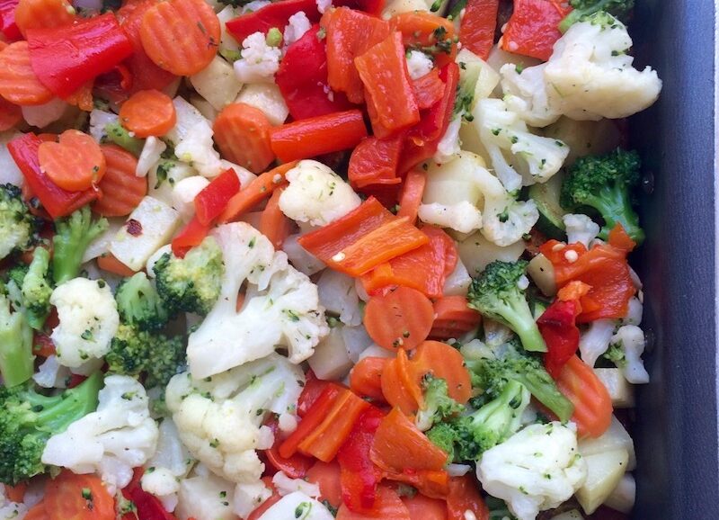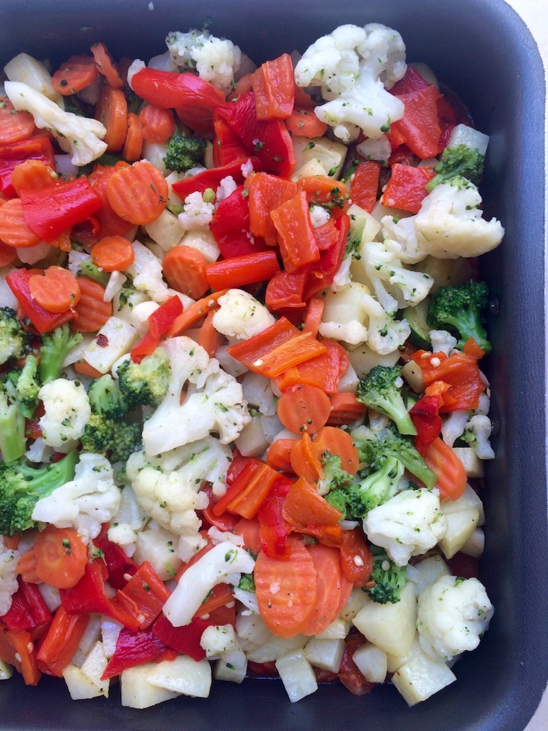 Incepeti prin a pregati tava in care veti pune legumele. Este bine sa fie asezata pe blatul de lucru, aproape de voi, pentru a putea adauga ingredientele pe masura ce sunt gata.