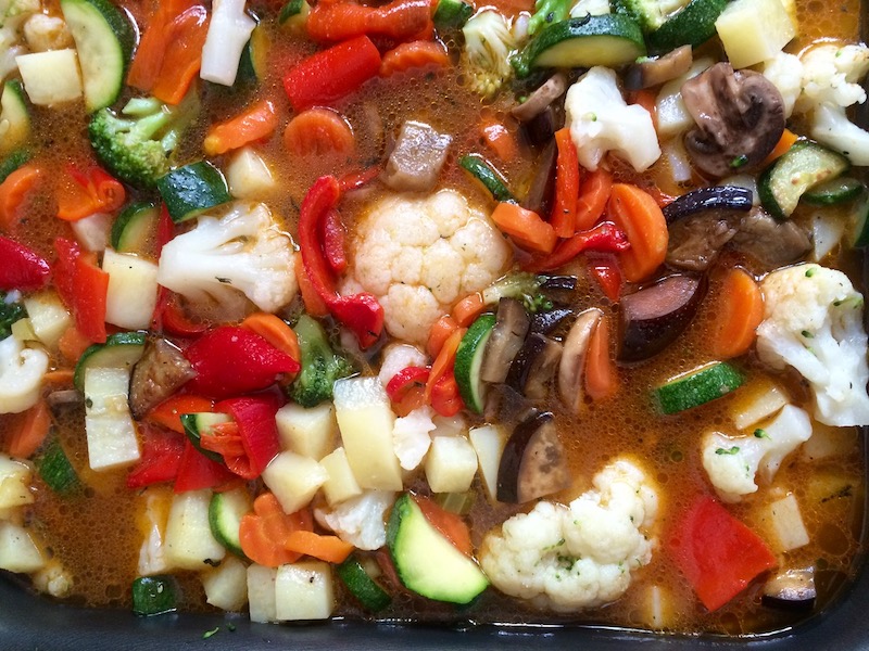 Pe masura ce pregatiti fiecare ingredient, il adaugati in tava alaturi de celelalte. Se adauga sucul de rosii, cimbrul, boiaua afumata, foile de dafin, apoi se potriveste de sare si piper. Se toarna putina apa fierbinte peste legume, cat sa ajute la formarea sosului, apoi tava se acopera cu folie de aluminiu.