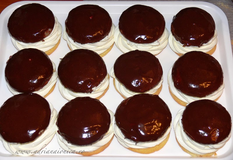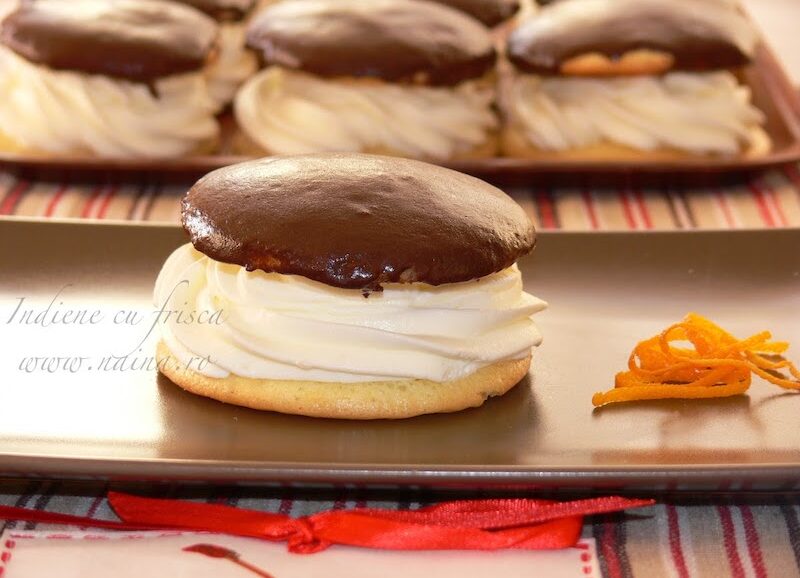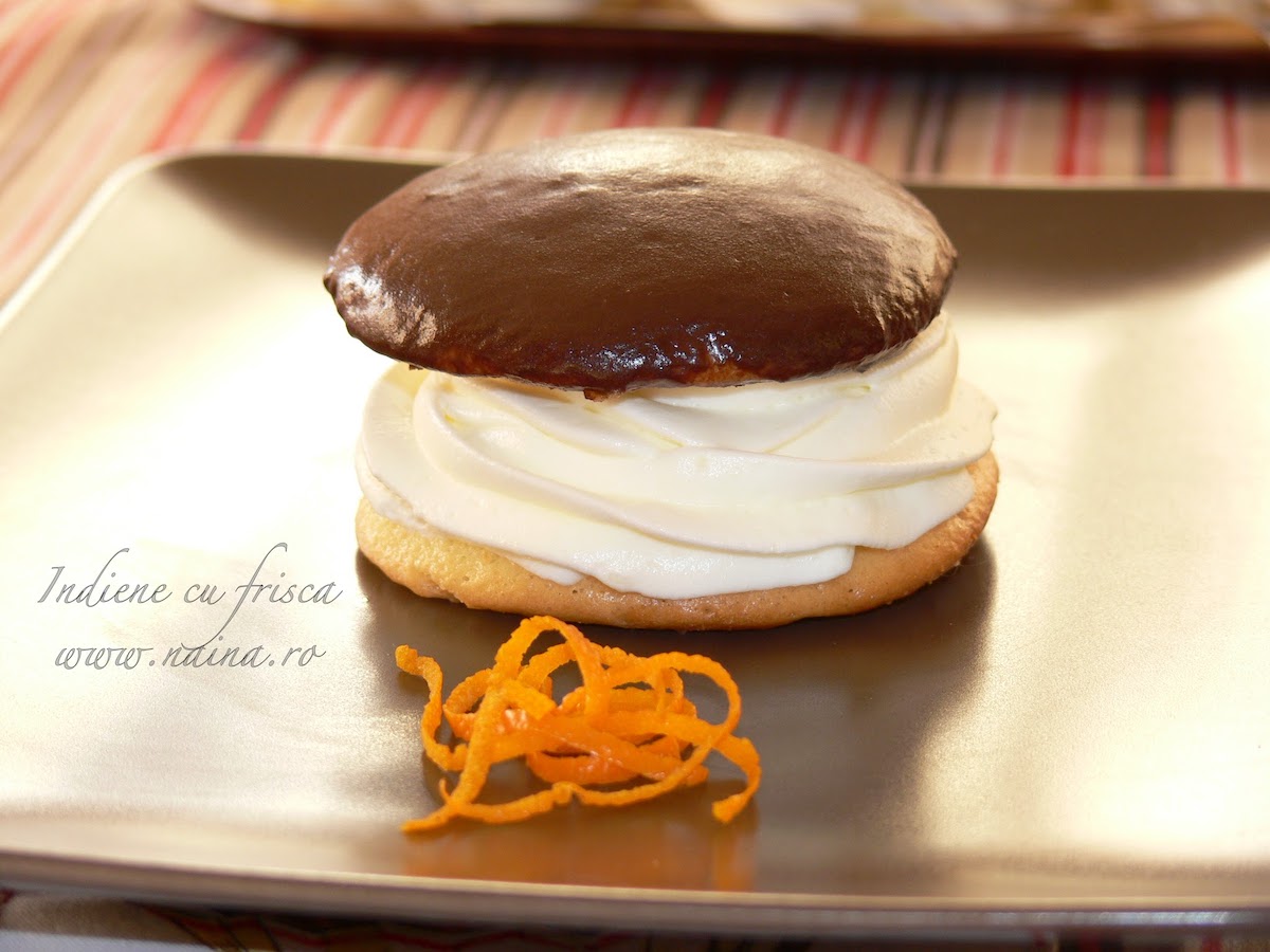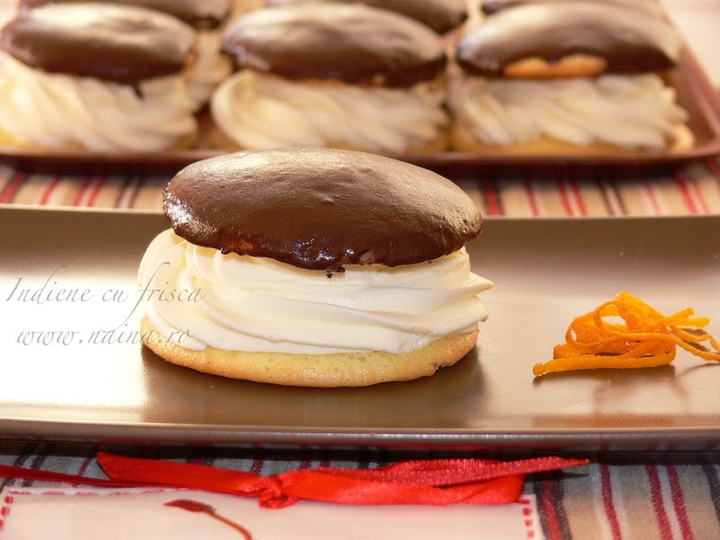 Capacele se trec prin glazura de ciocolata, apoi se aseaza peste partea cu frisca, formand astfel indienele.
