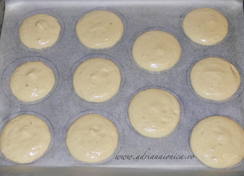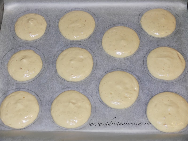 Compozitia obtinuta se pune intr-un pos si se formeaza cercuri pe o tava tapetata cu hartie de copt. Pentru a le face cat mai egale, puteti desena in prealabil cercuri pe hartie, apoi intoarceti hartia invers, pentru a evita urmele de creion pe aluat.
