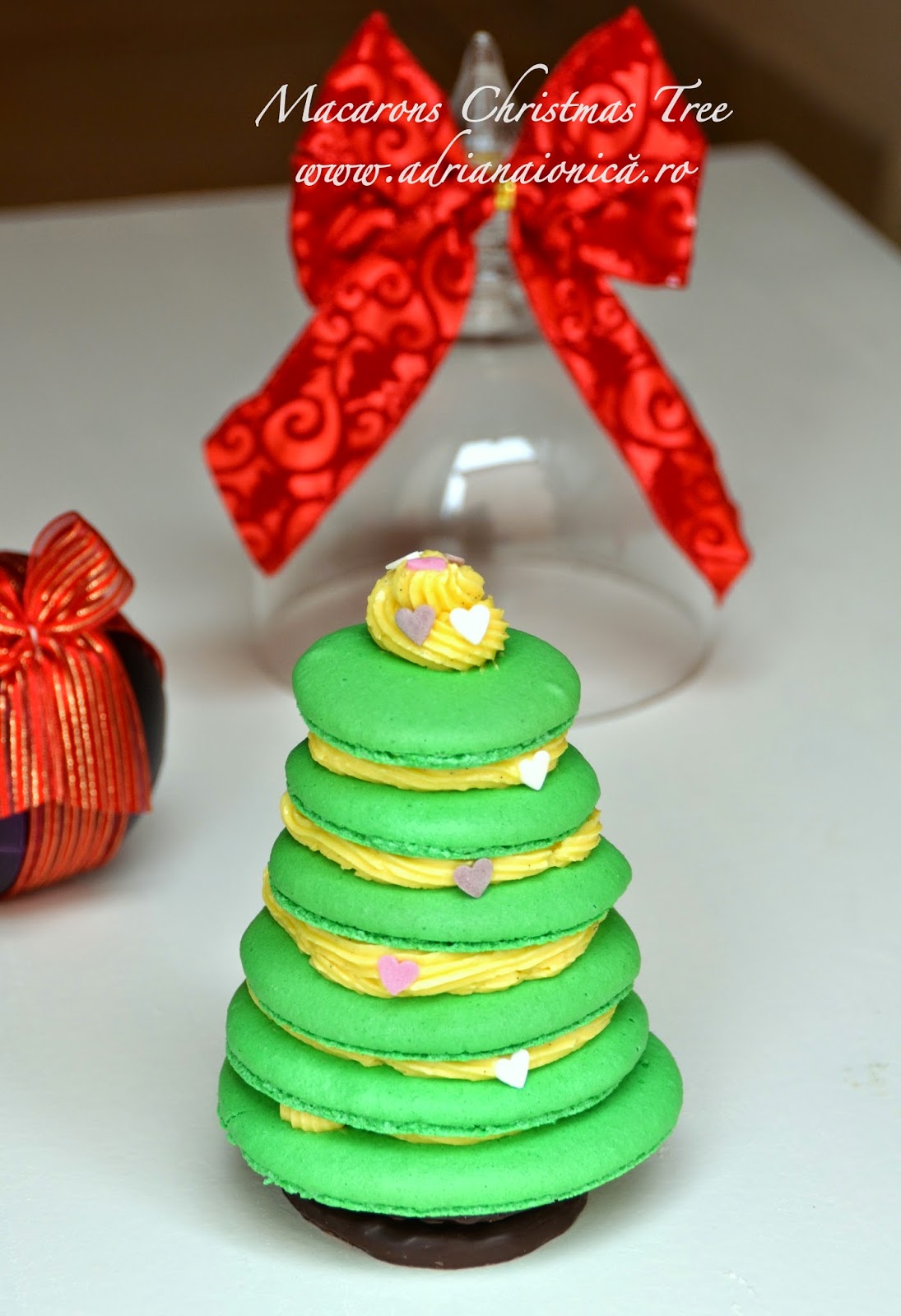 Montarea bradutului de macarons (ca in poza). Alege cochilii de macarons de marimi diferite. Pe fiecare baza de coaja, spriteaza un cerc de crema de vanilie, apoi acopera cu o alta coaja. Porneste de la cel mai mare macaron si continua cu dimensiuni din ce in ce mai mici, formand un „brad”. Deasupra, decoreaza cu un mot de crema de vanilie si ornamente: inimioare din zahar, perle, decoruri comestibile.