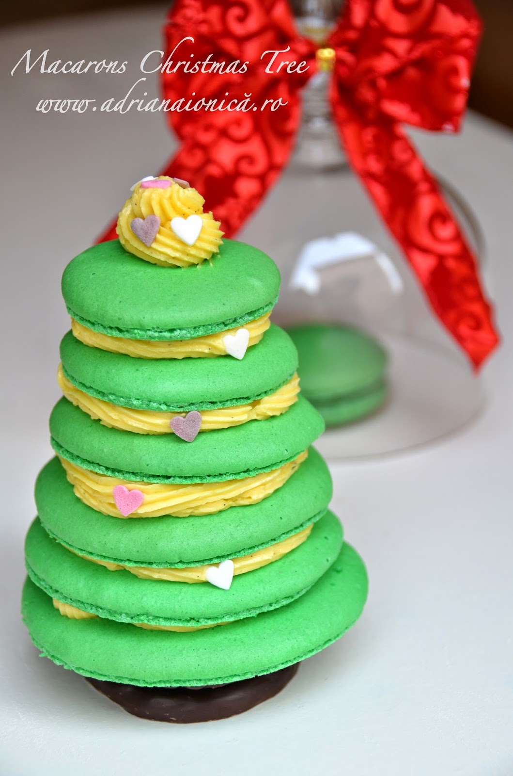 Montarea bradutului de macarons (ca in poza). Alege cochilii de macarons de marimi diferite. Pe fiecare baza de coaja, spriteaza un cerc de crema de vanilie, apoi acopera cu o alta coaja. Porneste de la cel mai mare macaron si continua cu dimensiuni din ce in ce mai mici, formand un „brad”. Deasupra, decoreaza cu un mot de crema de vanilie si ornamente: inimioare din zahar, perle, decoruri comestibile.