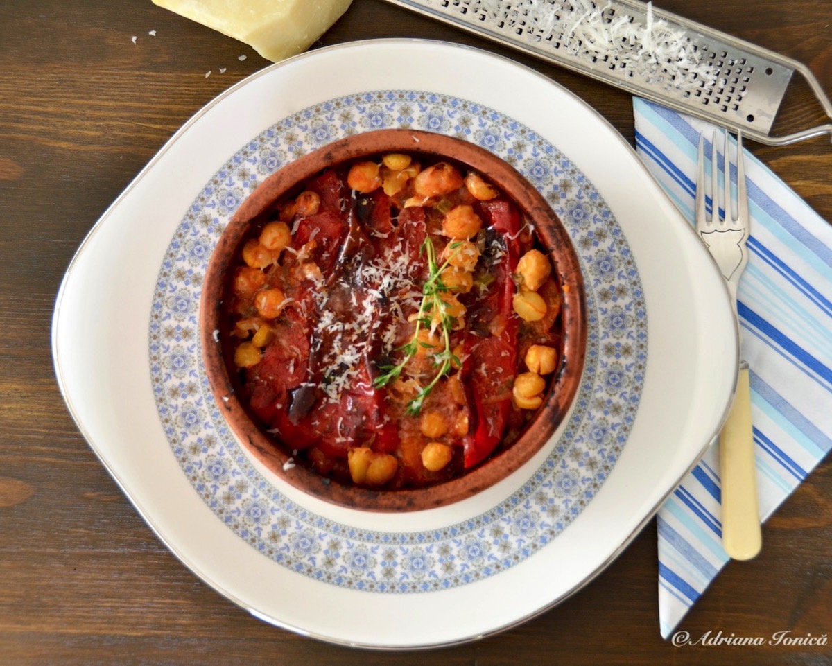 Deasupra se asaza ardeiul capia taiat pe lung. Vasul se acopera cu folie de aluminiu sau cu capac si se da la cuptor, la 180 de grade, pentru aproximativ o ora.