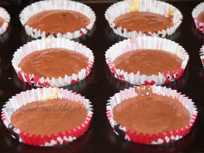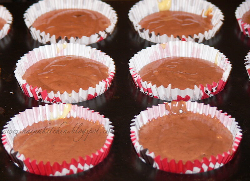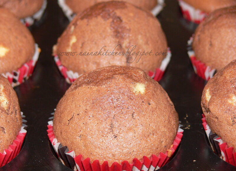 In formele de muffins asezam compozitia astfel: la baza punem stratul simplu, apoi adaugam bucati de ciocolata (sau, dupa preferinta, nuci, fructe sau stafide), iar deasupra completam cu compozitia cu cacao.