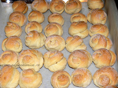 Formarea nodurilor. După ce aluatul a dospit, răsturnați-l pe o masă bine înfăinată. Întindeți-l ușor cu sucitorul și tăiați-l în fâșii de aproximativ 2 cm lățime. Luați fiecare fâșie, treceți-o prin făină și formați nodurile astfel: înfașurați banda de aluat de două ori în jurul degetelor, rupeți capătul, iar bucata ruptă treceți-o prin bucla formată, exact ca atunci când legați un nod. Așezați nodurile într-o tavă tapetată cu hârtie de copt. Coaceți-le în cuptorul preîncălzit la 180°C timp de aproximativ 20 de minute, până când încep să se rumenească ușor. Pentru o coajă moale: puneți pe nivelul inferior al cuptorului o tavă cu o cană de apă. Aburul le va păstra pufoase.