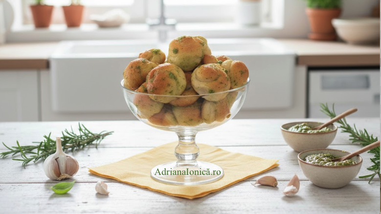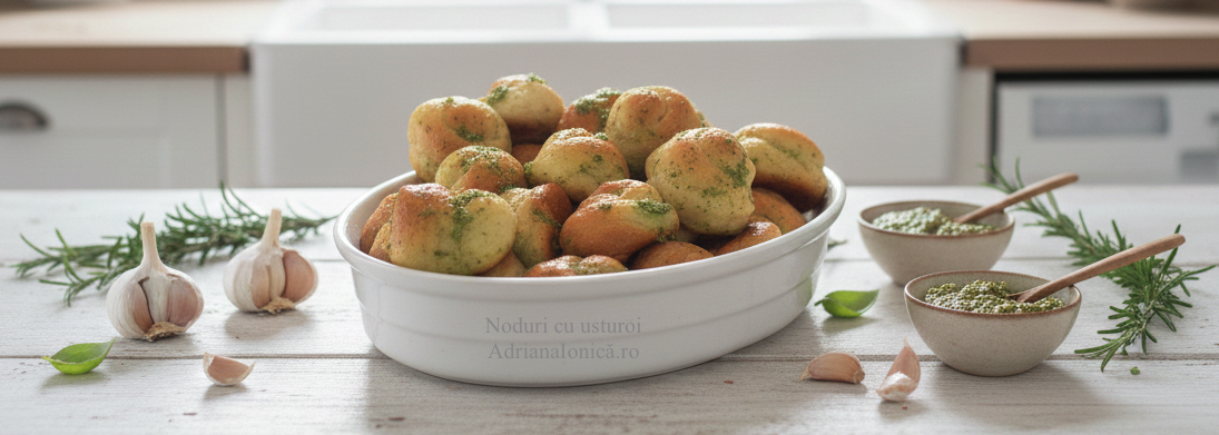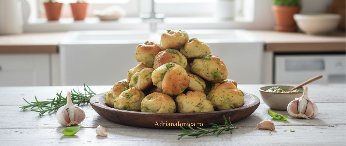 Baza este un aluat de pâine simplu și versatil, iar magia vine din sosul proaspăt de usturoi și pătrunjel, care învăluie nodurile imediat ce ies fierbinți din cuptor.
