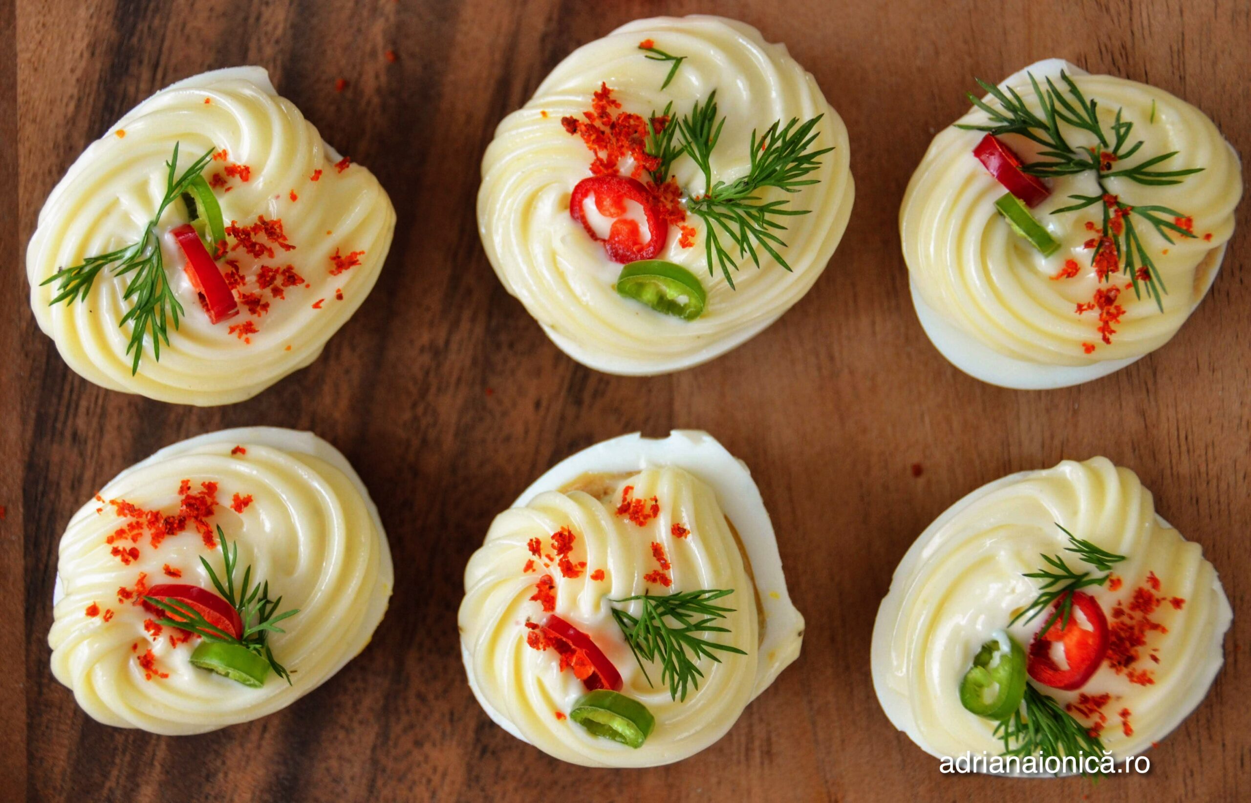 Pentru un mic truc de prezentare, pe platoul pe care asezati ouale puneti 2–3 linguri de smantana. Astfel, ouale vor sta fixe, nu se vor rasturna si vor arata mult mai bine. La final, presarati deasupra piper proaspat macinat sau putina boia.