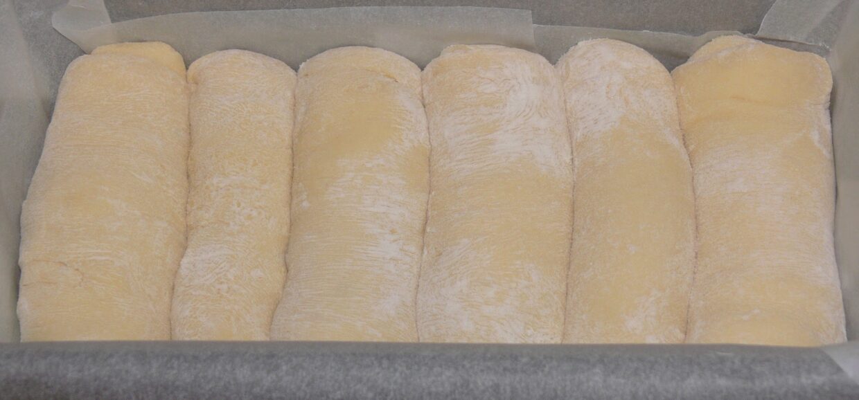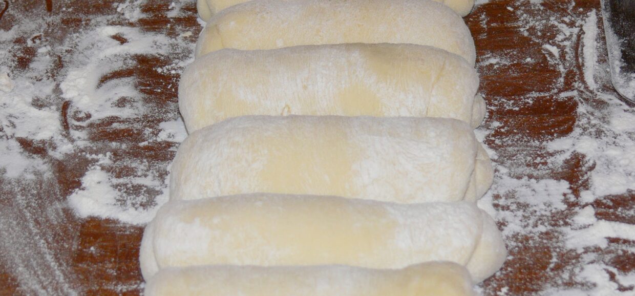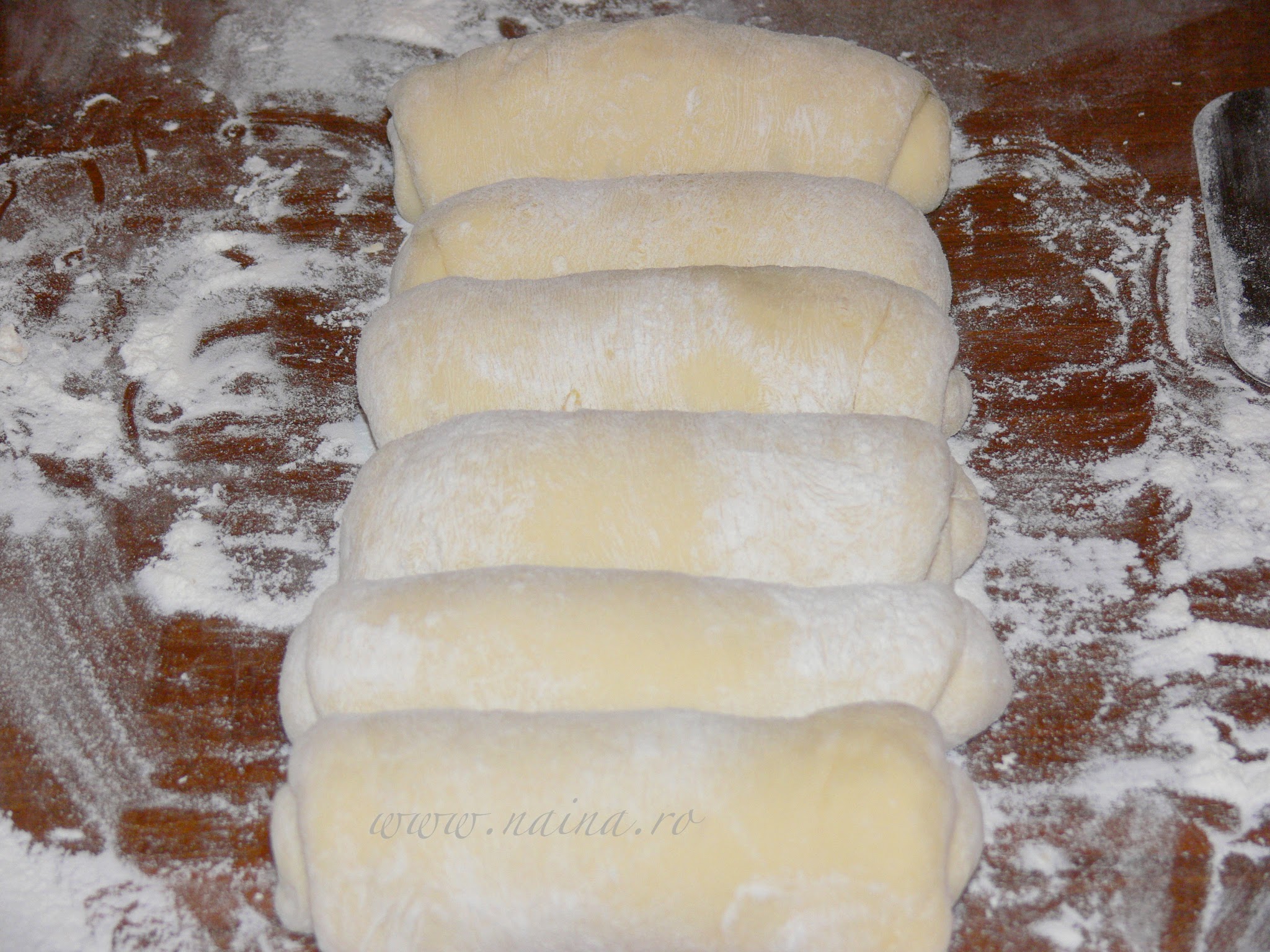 Modelarea painii. Dupa dospire, aluatul se imparte in 6 bucati egale. Fiecare bucata se intinde cu sucitorul sub forma de dreptunghi, apoi se ruleaza pe latura lunga. Rulourile se aseaza intr-o tava de cozonac tapetata cu hartie de copt si se mai lasa la dospit inca aproximativ 1 ora.