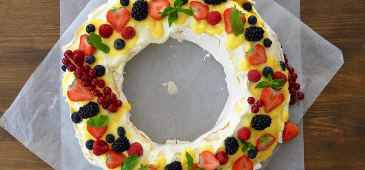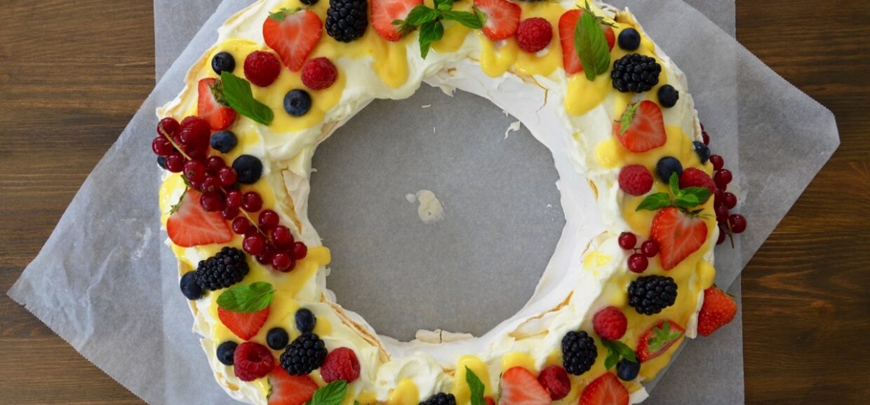 Forma de coronita, ca in imagine, nu doar ca arata de poveste, dar o face si foarte usor de portionat. Din cantitatile de mai jos iese o Pavlova mare, potrivita pentru aproximativ 10–12 persoane.