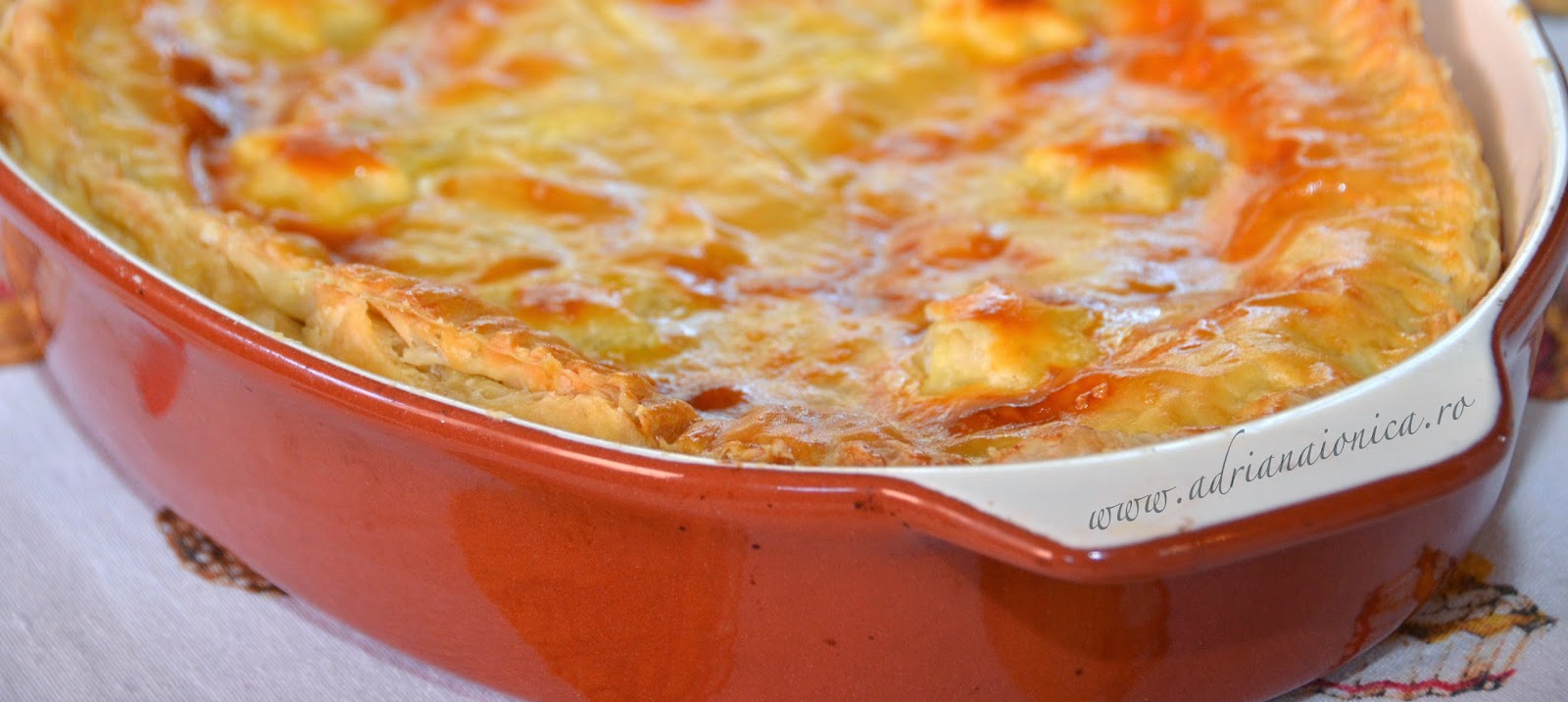 Intr-o tava se asaza prima foaie de foietaj, care se inteapa pe alocuri cu furculita. Peste ea se distribuie uniform compozitia pregatita, apoi se acopera cu cea de-a doua foaie de foietaj.