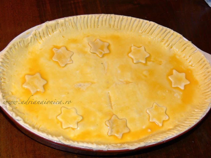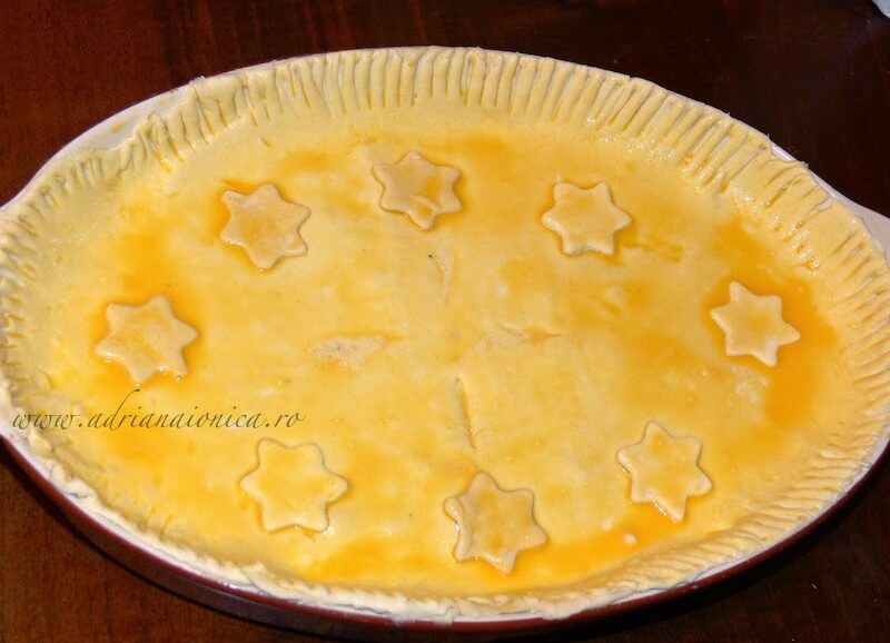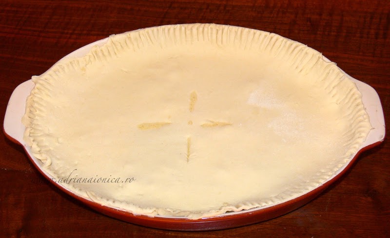 Marginile se taie daca depasesc tava, apoi se sigileaza apasand cu o furculita. Pe mijloc se face o crestatura cu cutitul sau se inteapa din loc in loc cu furculita, pentru a permite aburului sa iasa.